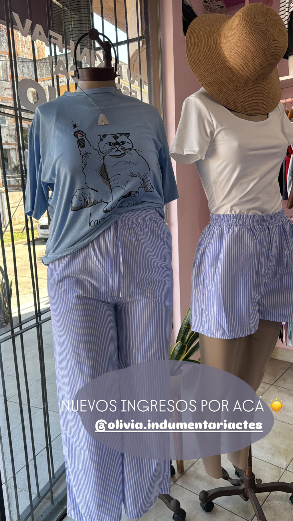 Pantalon largo recto y wide de poplin rayado. Tiene elastico en la cintura y tiras decorativas.
